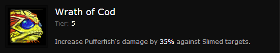 An essential component of every Pufferfish build, and just an awesome name for a Talent. Given the fact that the Level 16 Talent Slimy Pufferfish will automatically Slime targets in the Pufferfish’s landing zone, Wrath of Cod is just too good to pass up.