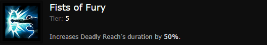 Movement speed bonuses are rarely, if ever, a bad thing. The added bonus to this, well, bonus, is that it can mean the difference between alive friends or food for your enemies. There may possibly be some overlap between this Talent and Overtake, allowing you to get ahead of a retreating enemy as you’re attempting to Deadly Reach them. This Talent is a good choice for healing builds, but some may prefer taking Fists of Fury, purely for basic attack generation.